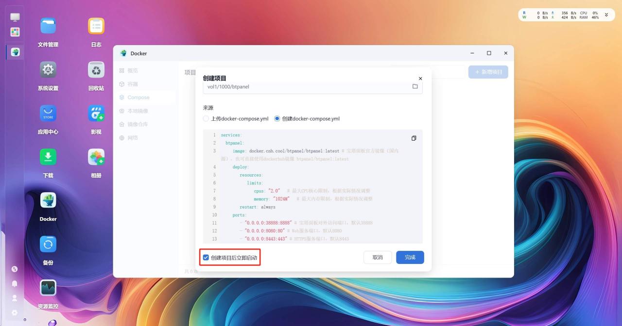 10. 构建完成后,在浏览器中输入http://IP:38888/btpanel(IP为飞牛 NAS 的IP地址),输入用户名btpanel,密码btpaneldocker登录宝塔面板。